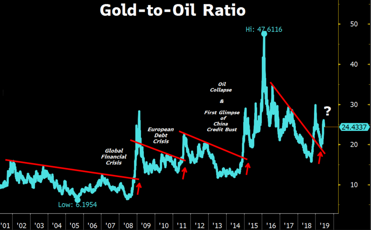 Что ещё стоит отметить когда мы говорим о золоте. Драгоценный металл находится в восходящем тренде с конца апреля. Это вкупе с недавним снижением цен на нефть более чем на 22% очень показательно. Значительное увеличение отношения золота к нефти имеет тенденцию предшествовать критическим моментам на фондовых рынках и в мировой экономике.