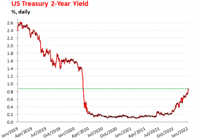 Доходность двухлетних казначейских облигаций начала расти в конце сентября примерно с 0,23% и закончила год на уровне 0,73%. За пять торговых дней с тех пор она подскочила до 0,87%, самого высокого уровня с 28 февраля 2020 года. Основной скачок произошел в среду и четверг, вызванный ястребиными протоколами ФРС в среду.
