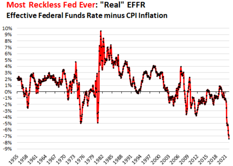 В «реальном» выражении, с поправкой на инфляцию ИПЦ, «реальный» EFFR составляет отрицательные 7,4%, что является самым отрицательным реальным EFFR в данных, относящихся к 1954 году. Это результат одной ошибки политики за другой: