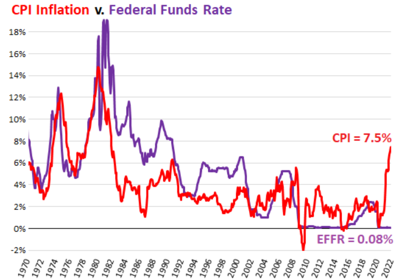 Итак, теперь ФРС создала эту сумасшедшую ситуацию, когда процентная ставка, которую ФРС подавляет своими политическими ставками, эффективная ставка по федеральным фондам (EFFR), является почти нулевой (0,08%), а инфляция ИПЦ составляет 7,5%, производя самый широкий разброс между ними с 1955 года.