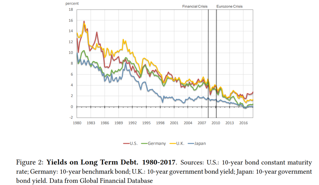 Сегодня можно сказать, что тенденции которые когда то захлестнули японскую экономику набирают силу во всём мире в целом. Следующий график это доходности государственных 10 летних облигаций: