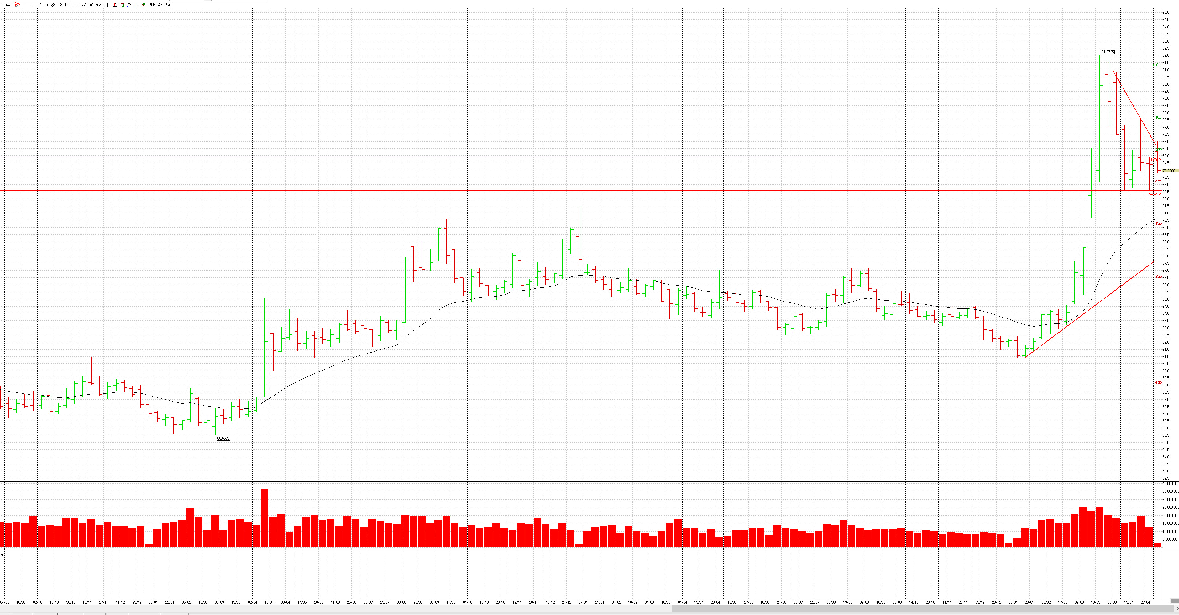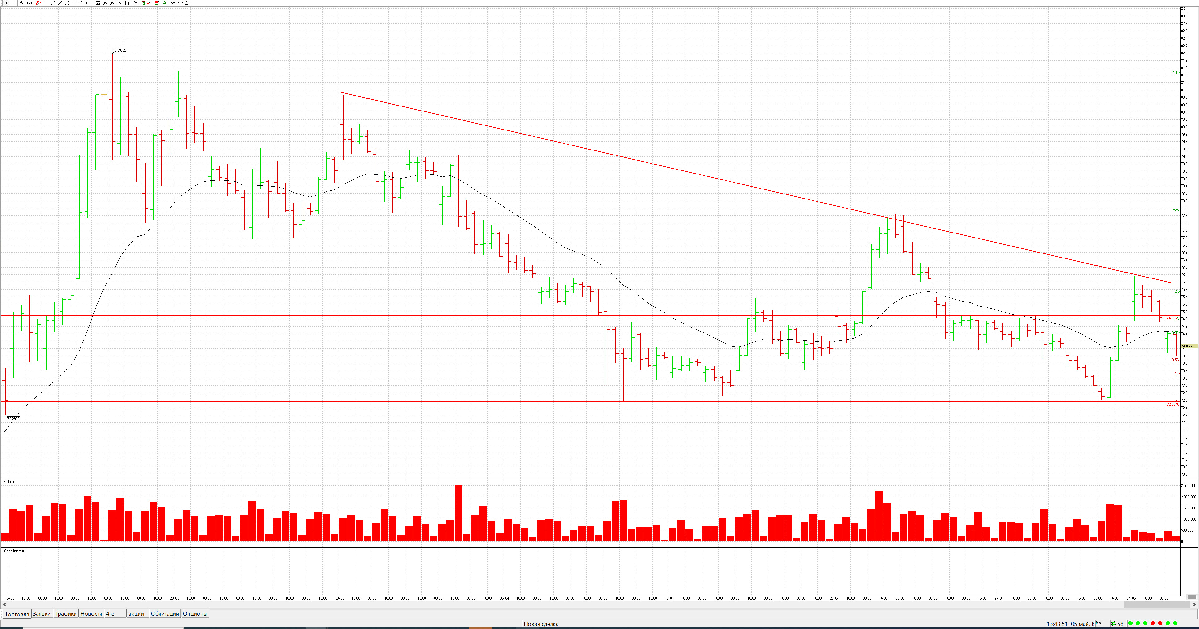 для особо непонятливых бсмотрим недельный график. Фигура клин с нижней границей 69р. Именно туди и идет ТОМ. А дальше будет торговаться в клине.