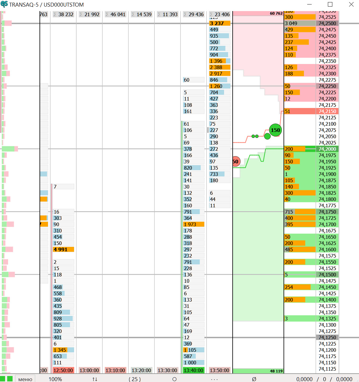 — там где цена «бьется об уровень» по хорошему должны сильно расти объемы, а тут как бы на нижней границе объемы минимальные и желающих там продавать почти нету.