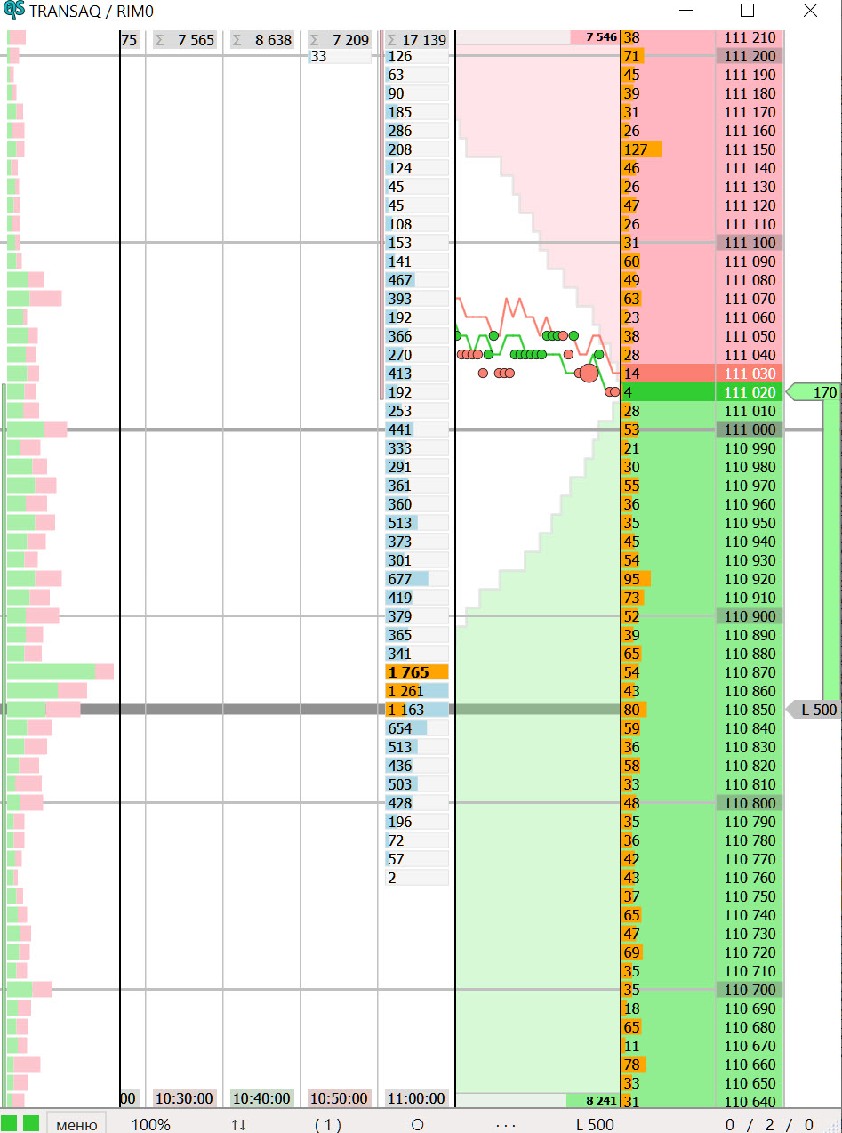 Друзья, в РТС маркетмейкер скинул остатки неуверенных на уровне 110850 и теперь полностью разгрузившись цена будет идти вверх. Обычно именно так и происходит. Тренд на часовике начинает образовываться. Этот момент мною был использован, чтобы зарядить котлету от которой вчера на вечерке мне пришлось избавиться. Сидим, курим бамбук. Полет нормальный...
