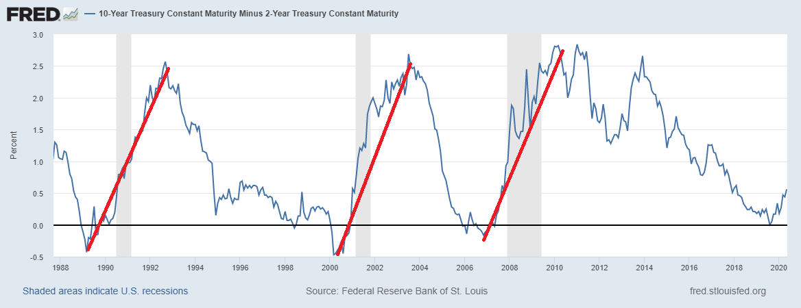 Следующая картинка прекрасно иллюстрирует цикличность на финансовых рынках, а также стратегии «риск-он» и «риск-офф». На данном графике изображен спред между 2-летними и 10-летними трежерис.