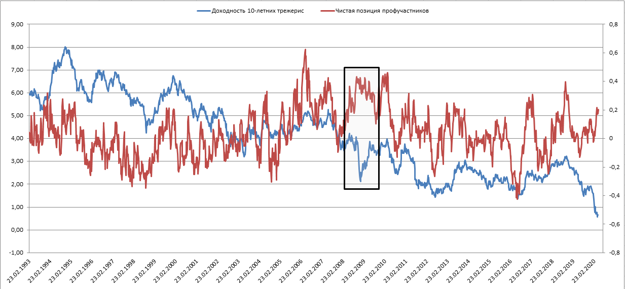 Красная линия – это чистая позиция профессиональных участников рынка, которые используют срочный рынок для переноса риска. Мы видим, что сейчас участники держат чистую длинную позицию по фьючерсам на длинные трежерис, т. е. эта ситуация соответствует ожиданиям снижения ставки. Однако динамика ставки коррелирует с показателем чистой позиции — и это означает, что хеджеры просто переносят риск, и сейчас рынок в дивергенции — так же, как это было в 2009 году, после чего, напомню, ставки выросли.