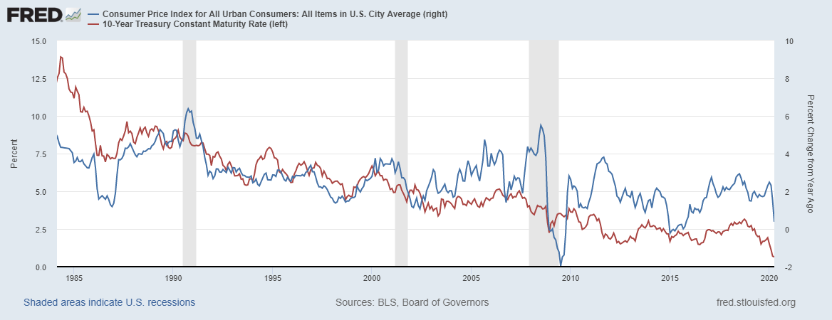 Инфляция изображена синей линией; красная линия – доходность 10-летних трежерис.