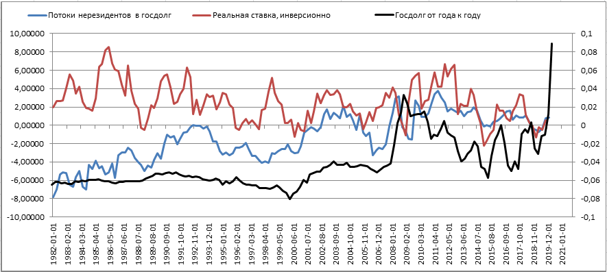Красная линия – это реальная ставка, а синяя линия – годовая динамика спроса на госдолг США со стороны нерезидентов. Реальная ставка здесь также взята инверсионно. Черная линия – это динамика госдолга от года к году; о ней чуть ниже.