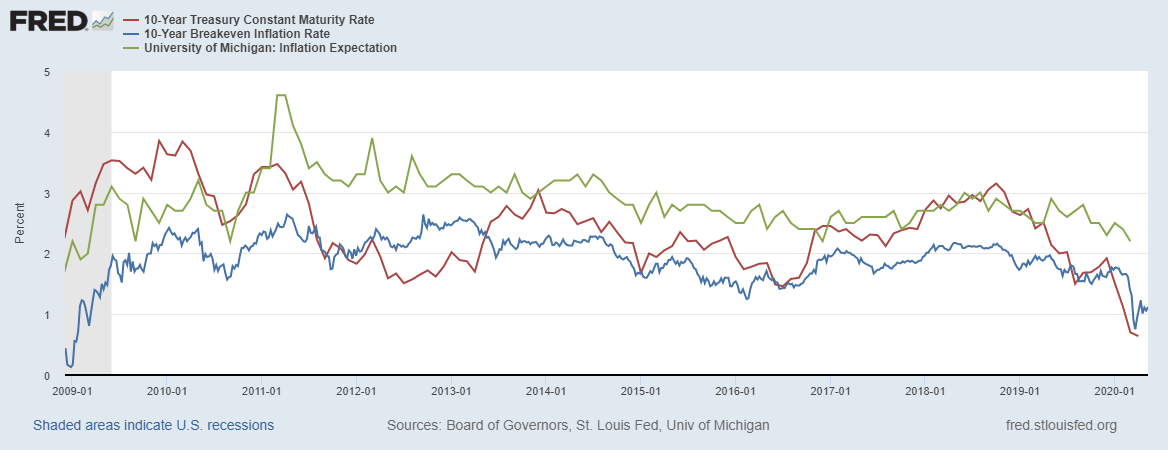 В пятницу выйдет индекс инфляционных ожиданий от Мичиганского университета, но можно предположить, что едва ли кто-либо из экономических агентов ожидает роста инфляции. На приведенном ниже графике видно, что ожидаемая инфляция (зеленая линия) следует за потребительской.