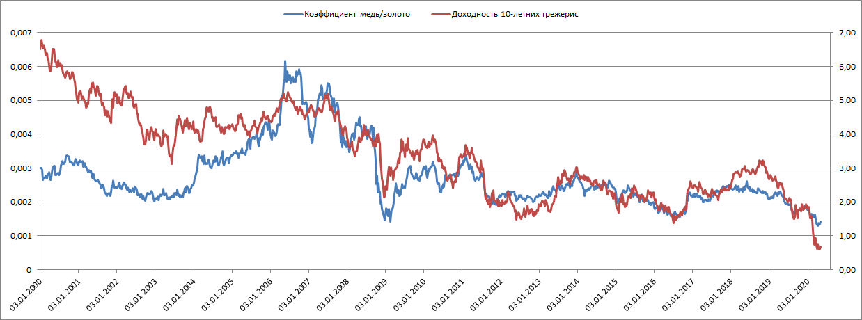 Синяя линия – отношение цен на медь к ценам на золото. Наблюдаем затяжной цикл низких ставок и снижения цен на медь — при этом видим сильнейшую связь со ставками 10-летних трежерис. Коэффициент цен пытается развернуться, в то время как доходность трежерис сильно провалилась. Нечто похожее было в 2013 году и — инверсионно — в 2019 году, перед снижением ставок ФРС.