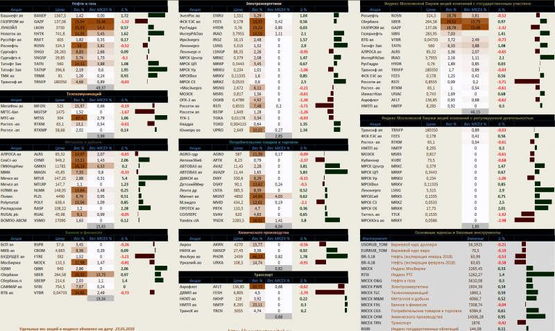 Динамика акций за текущий день, в структуре отраслевых индексов, и индексов государственного сектора.