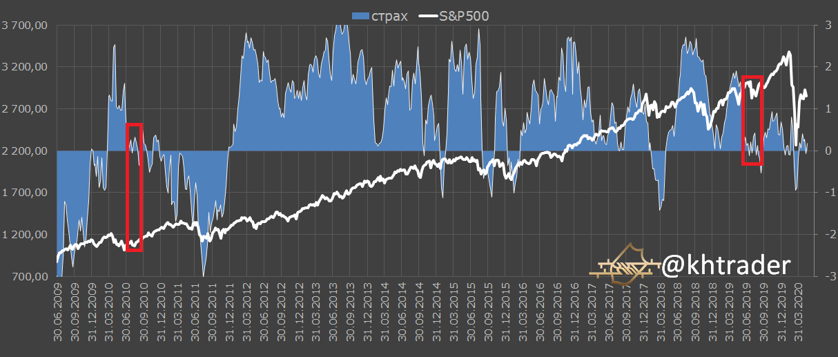Наконец, весьма важным является вопрос аппетита к риску, т. к. именно активам фондового рынка свойственны риски. На картинке ниже — иллюстрация моей авторской модели оценки уровня страха у крупных участников рынка. Модель строится на базе распределения позиций из отчетов СОТ