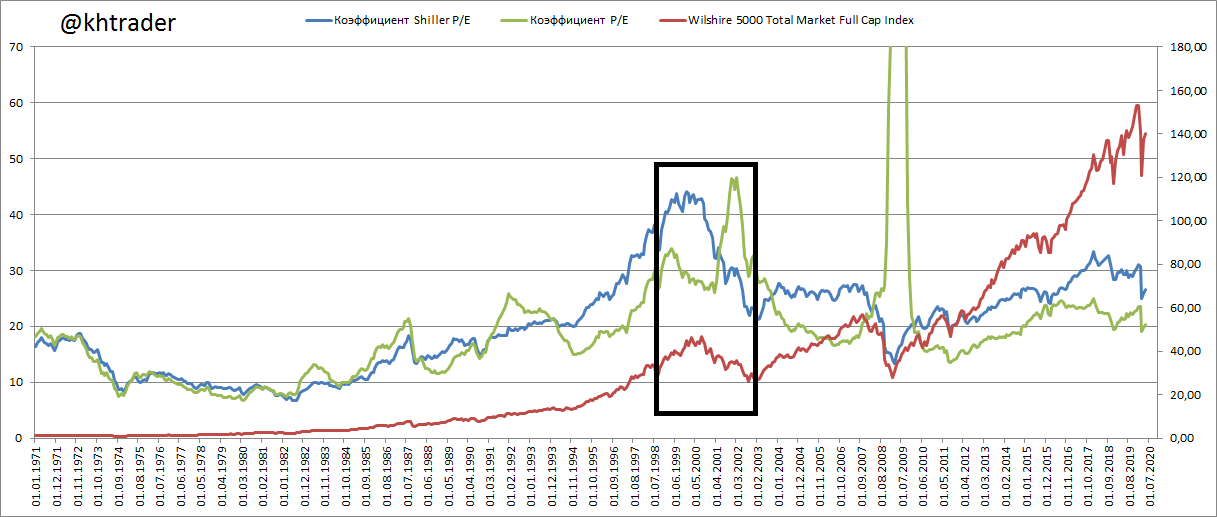 Первым делом зададимся вопросом: есть ли пузырь на фондовом рынке? Для ответа на этот вопрос возьмем простой коэффициент «цена/доходность» — и его же, но в интерпретации Шиллера