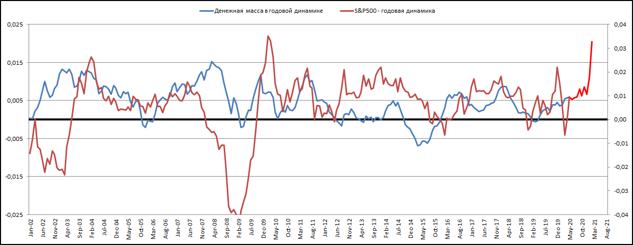 Мы видим, что динамика денежной массы детерминирует фондовый рынок. Здесь все просто: если дешевых денег много — как сейчас,— то они рано или поздно пойдут на рынок. Собственно, этот процесс мы сейчас и наблюдаем.