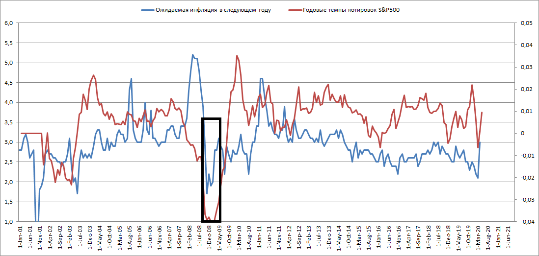 Итак, мы видим, что в мае потребители ожидают резкого роста инфляции в следующем году,— так было и в момент кризиса 2008 года, когда рост инфляционных ожиданий совпал с дном рынка.