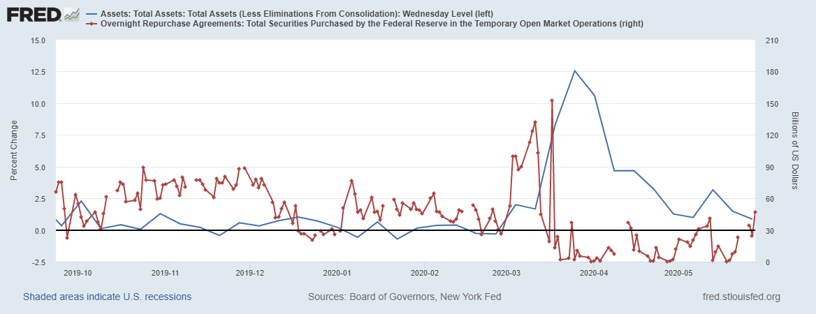Красная линия – это дневные РЕПО в рамках которых ФРС предоставляет ликвидность. Логично, что что снижение объемов РЕПО снижает темпы роста баланса ФРС, при этом на вчера объемы РЕПО снова растут. Конечно, проблема в бизнесе не сняты и как минимум дефолты в нефтегазовой отрасли продолжаются, что из-за невозврата кредитов, создает дыры на финансовом рынке.