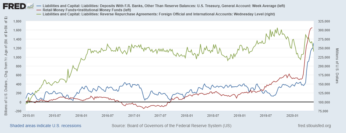 Самое интересное здесь – это красная и синяя линии, которые отображают потоки в денежные фонды, которые входят в денежную массу и счет Казначейства соответственно. Счет Казначейства вырос на 116 млрд долларов, потоки в денежные фонды замедляются в годовом выражении. РЕПО для нерезидентов, показатель нанесен зеленой линией – снижаются и это весьма позитивно для внешнего спроса со стороны нерезидентов на доллар США.