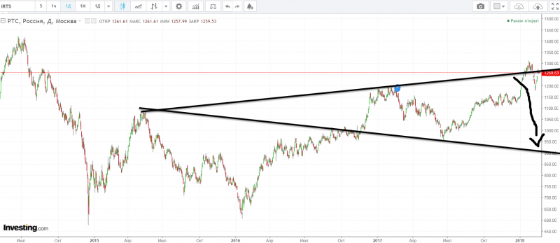 Как то я постил картинку с этой волной вульфа на индексе РТС. И от точки входа индекс уже падал на 10%. Но зона отработки в волне находится намного ниже. Перед падением же в волне инструменты часто делают ложный заход вверх. Уже эта неделя покажет нам находимся ли мы всё ещё в этой волне. Я думаю что да.