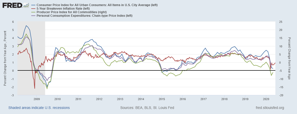Как видим, также как и в прошлый кризис, начинает расти ожидаемая инфляция, пока все скромно. При этом, в мае индекс ИЦП из-за роста цен на товарном рынке отскочил от минимумов, что может сигнализировать о дне уровня цен в экономике США. Показатели потребительской инфляции пока снижаются.
