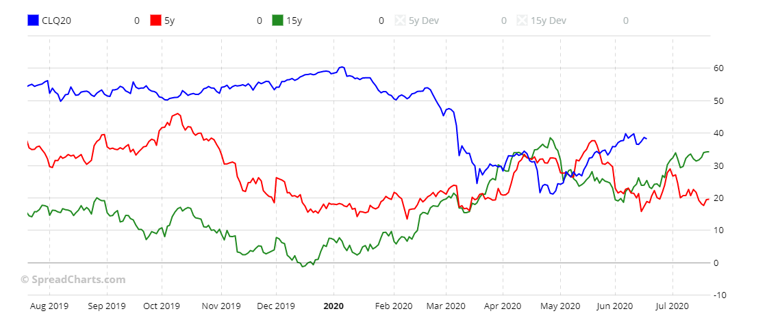 Фьючерсная кривая, нанесенная рыжей линией, продолжает сокращать контанго. Положение фьючерсной кривой выглядит нормально, и мы снизились к уровням начала года.