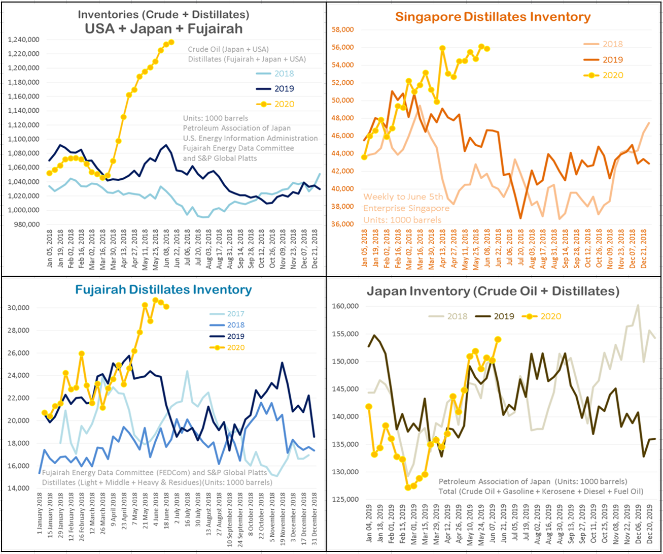 Совокупно дистилляты плюс сырая нефть на ведущих хабах Япония+США+Фуджайра (ОАЭ) растут, это и нанесено на первой картинке.
