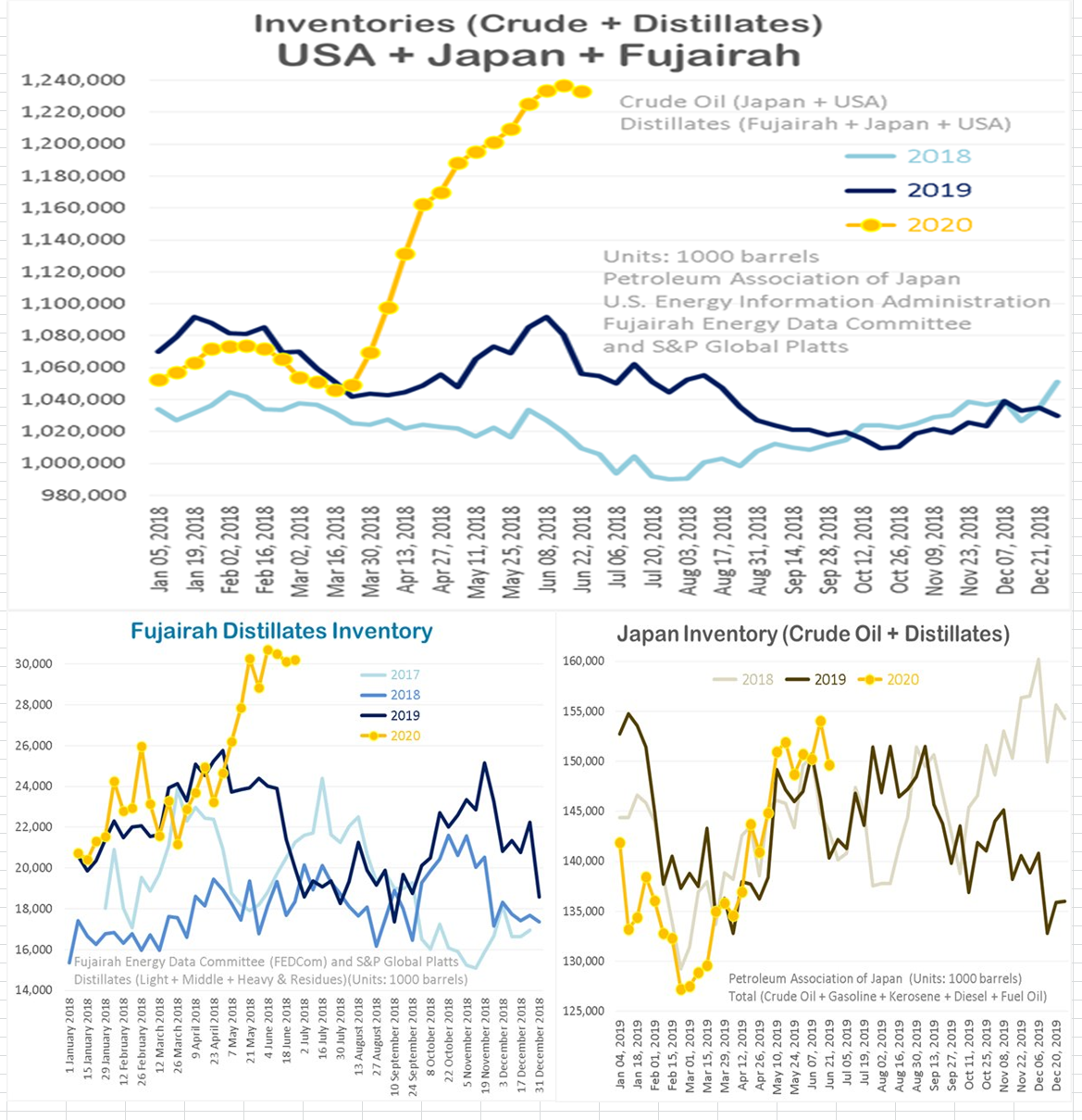 1) Совокупно дистилляты плюс сырая нефть на ведущих хабах Япония+США+Фуджайра (ОАЭ) растут, но темпы роста замедляются и на прошлой неделе мы видим незначительное сокращение;