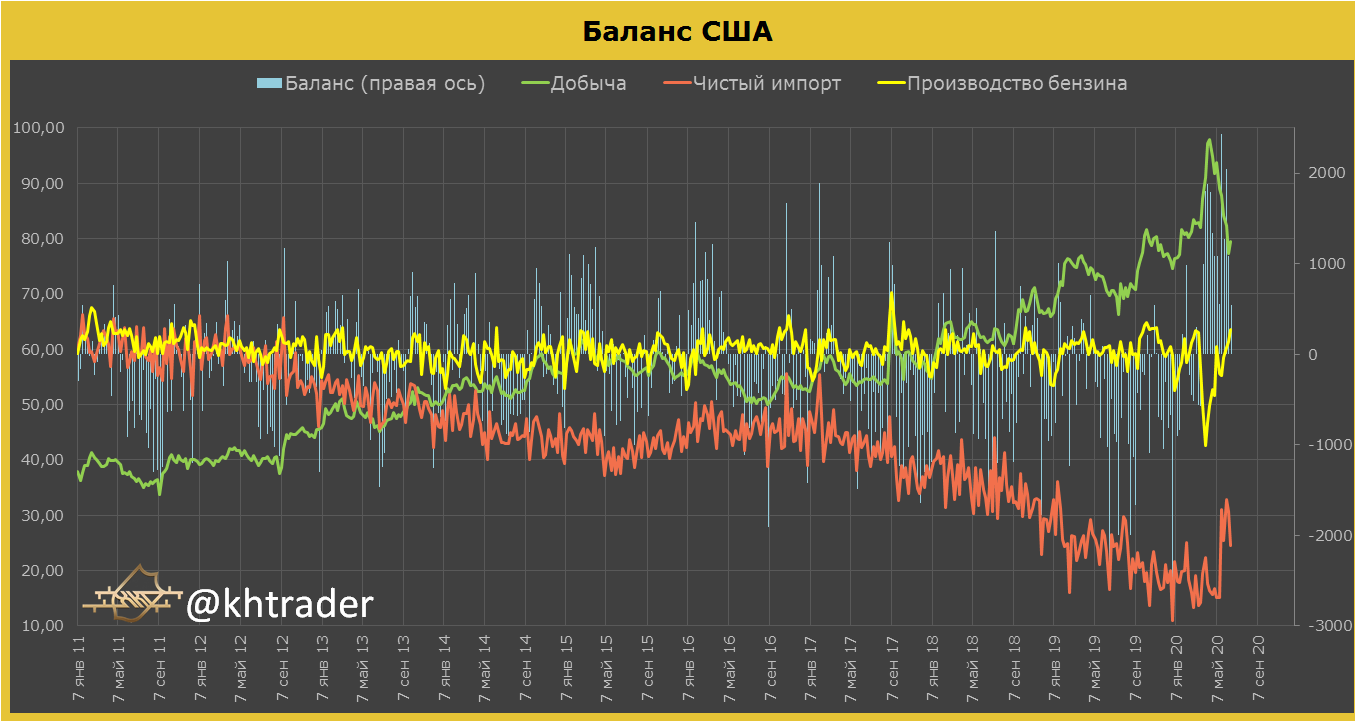 Итак, суточный баланс рынка нефти в США (11 + 3,383) – 13,84 = +0,543 мб/д (см. гистограмму), недельный баланс получил прирост в 3,8 млн баррелей за неделю. Общие запасы сырой нефти с учетом SPR выросли на 3,43 млн баррелей.