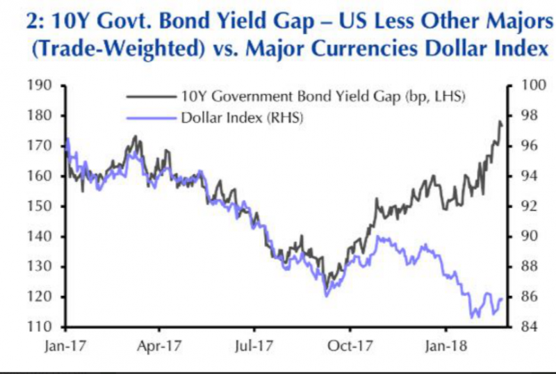 На картинке: Индекс доллара и разница между доходностями 10Y UST и аналогичными суверенными бондами крупнейших торговых партнёров США (с учетом их веса).
