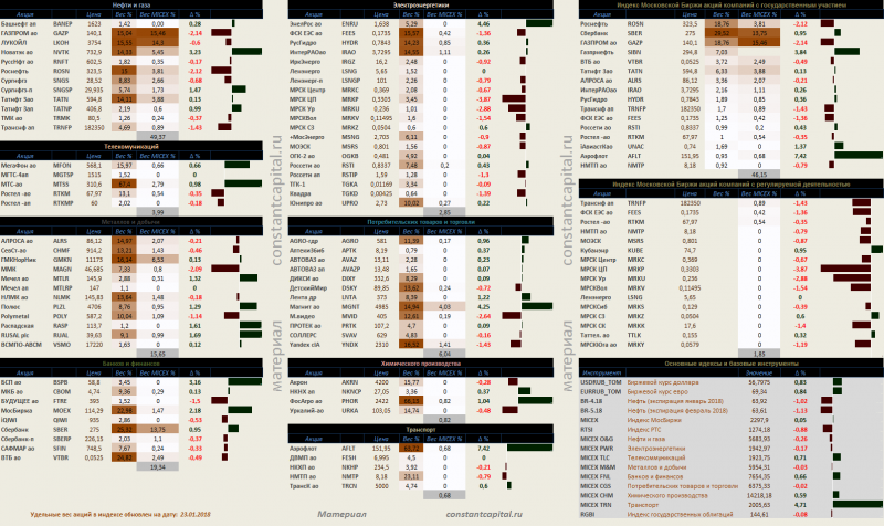 Динамика акций за текущий день, в структуре отраслевых индексов, и индексов государственного сектора.
