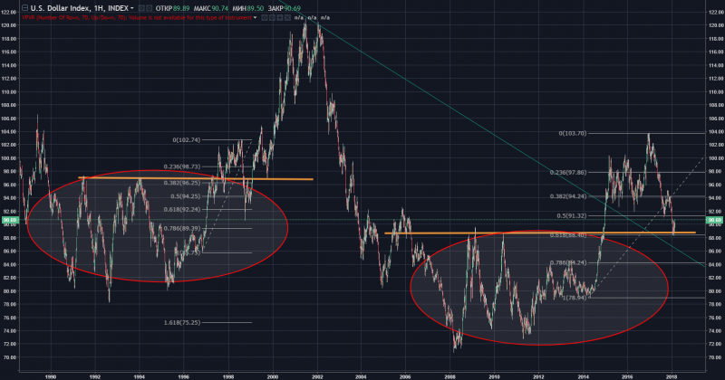 Сегодняшняя картина очень похожа на ту, что наблюдалась на рынках в конце 90-х: после продолжительного бокового движения Индекс доллара перешел к резкому росту, далее произошла коррекция в 0,618, впоследствии рост американской валюты возобновился.