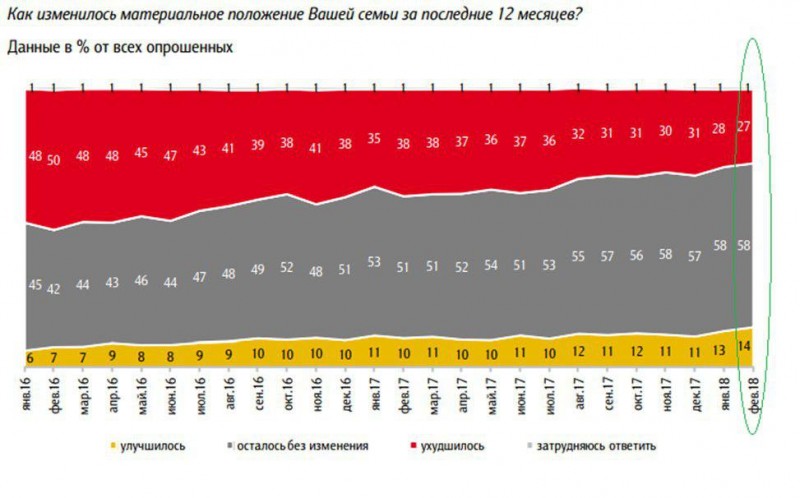 Оценки россиянами собственного материального положения вернулись на докризисный уровень. В первом квартале ожидается рост реальных доходов населения. экономика 04.03.18 00:17 5701 Ostap +2 2 комментария Олег 04.03.18 01:23 # ↓ Хм… улучшилось по сравнению с чем? опять эффект низкой базы не учтен в опросе, снова население за дураков держат? Krechetov 04.03.18 01:25 # ↑ ↓ насколько я понял по новостям то к уровню 2014 вернулись показатели. Странно что тут графике к 16 года :) но главное что улучшаются ИМХО