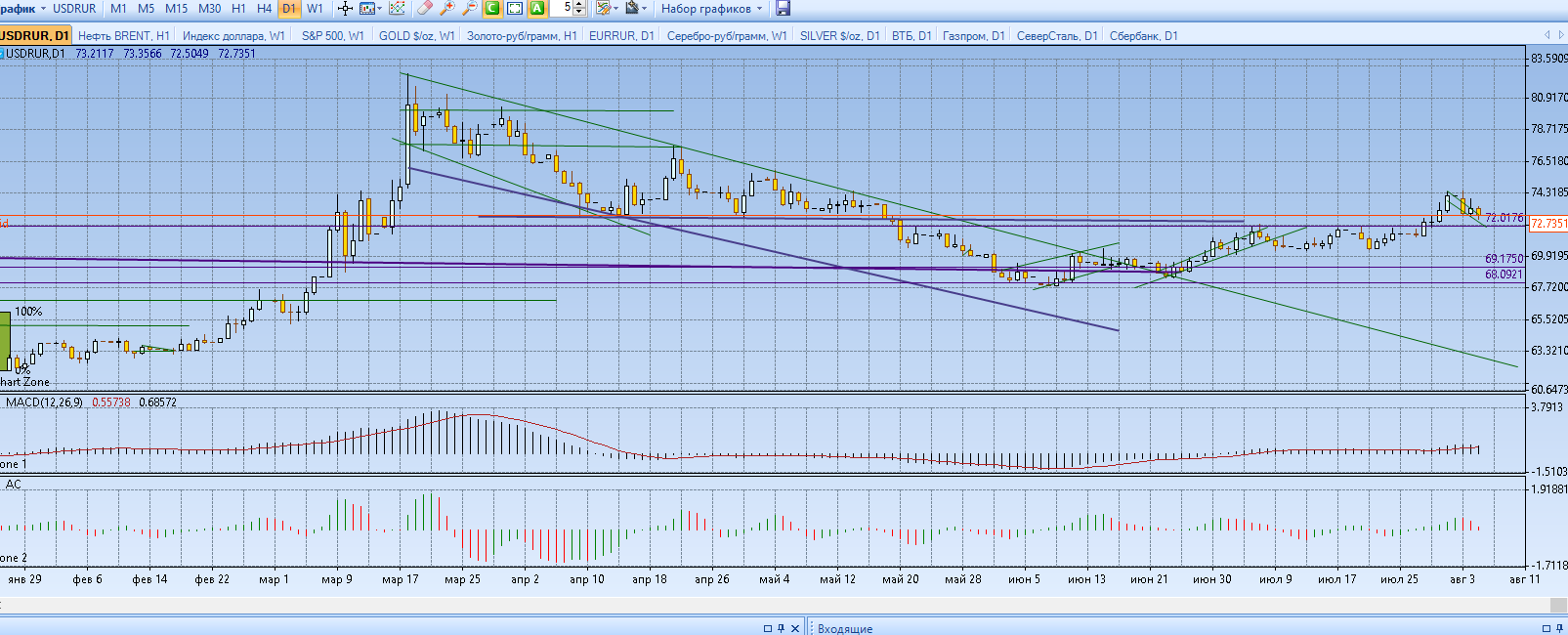 И в заключение. Валюта. SI фьючерс доллар рубль. В данный момент сегодня на закрытие рынков Si закрылся над уровнем поддержки. По Моему мнению идем на уровень 71-69. Не забываем что Центробанк здесь заказывает музыку. Если в друг! подчеркну я не всевидящий, ситуация будет развиваться в положительном ключе то можем сходить на значение 63. График том доллар рубль если что. Позиция шорт.