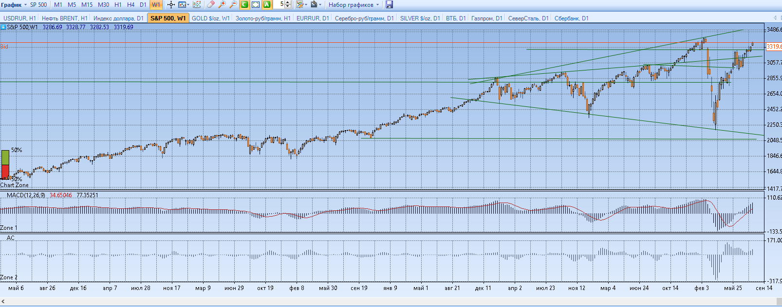 Индексы. S&P 500. Я не меняю своих значений по максимуму куда можем прийти, но возможен отскок на 3220 или 2900 с последующим ростом на 3500. Позиция недельная в шорт долгосрок Лонг.