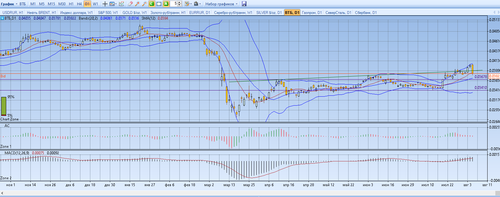 Банковский сектор. ВТБ проецируется на уровень 0,3682 с возможным уходом на 0,3410. Позиция шорт