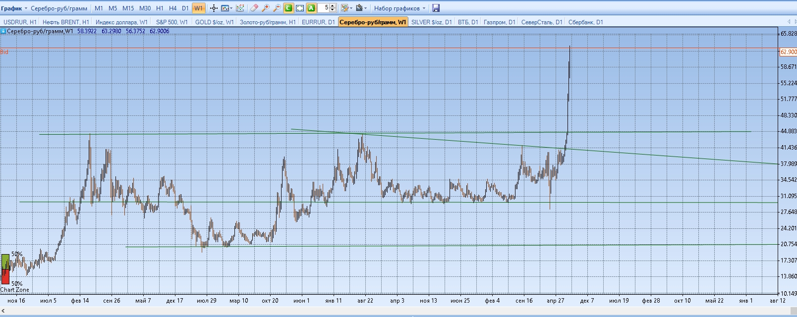 1. Металлы серебро. Так как мы идем к историческим максимумам, то чего не было еще то не могу прочертить более точное значение. Ориентир по серебру около 70 рублей. Позиция лонг.