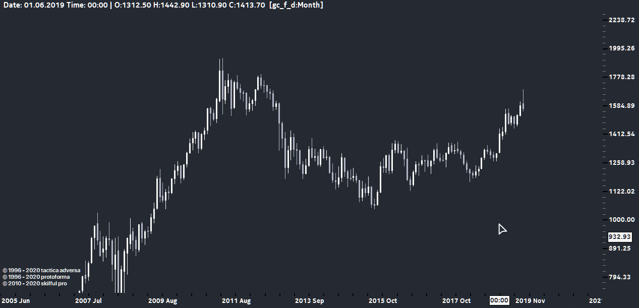 Давайте посмотрим на график золота и с помощью минимально возможным интсрументом анализа примем торговое решение, месячный план: