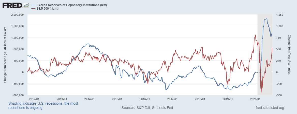Надо сказать, что рост избыточных резервов и снижение банковского мультипликатора достаточно обнадеживающе, т.к. это должно поддержать финансовые рынки.