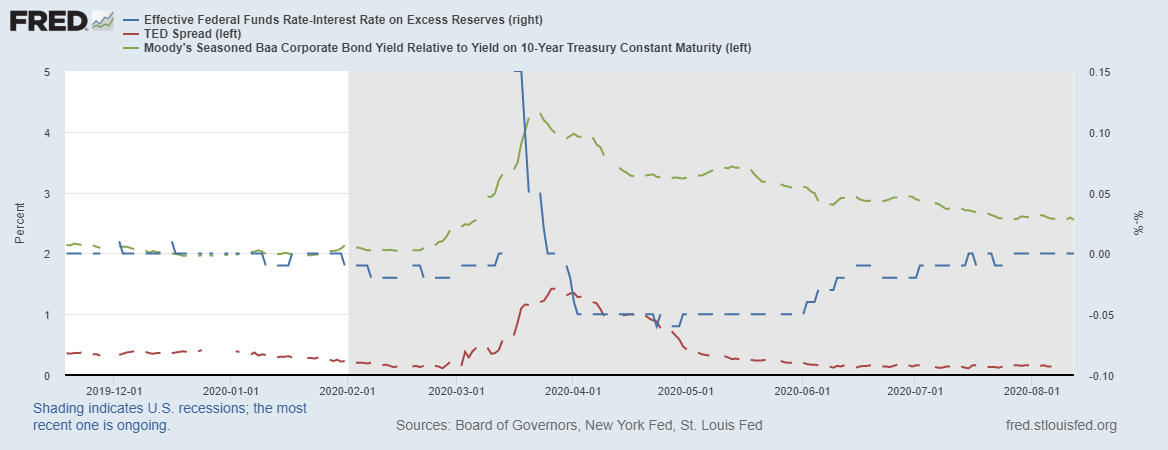 Зеленая линия – спред между ставкой по 10-летним корпоративным облигациям и 10-летним трежерис. Показатель продолжает затухать, но остается выше докризисных уровней.