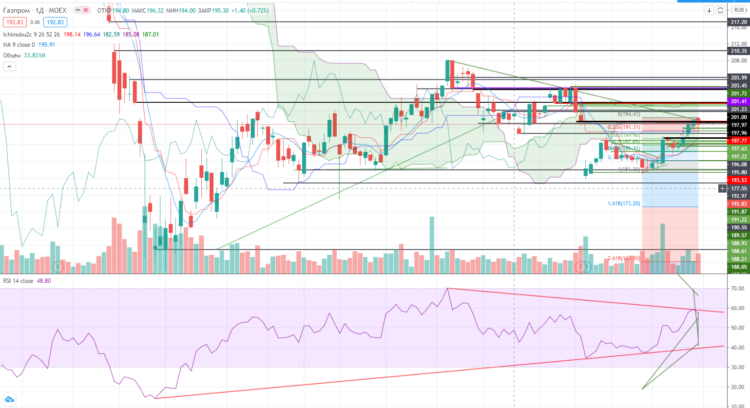 На дневном графике Газпрома так и не взято в боевом режиме сопротивление 193,6, и преспокойно он может скорректироваться до уровня гэпа 189,7-190,5, там можно снова покупать, ибо все таки пока импульс вверх не отработан до конца.