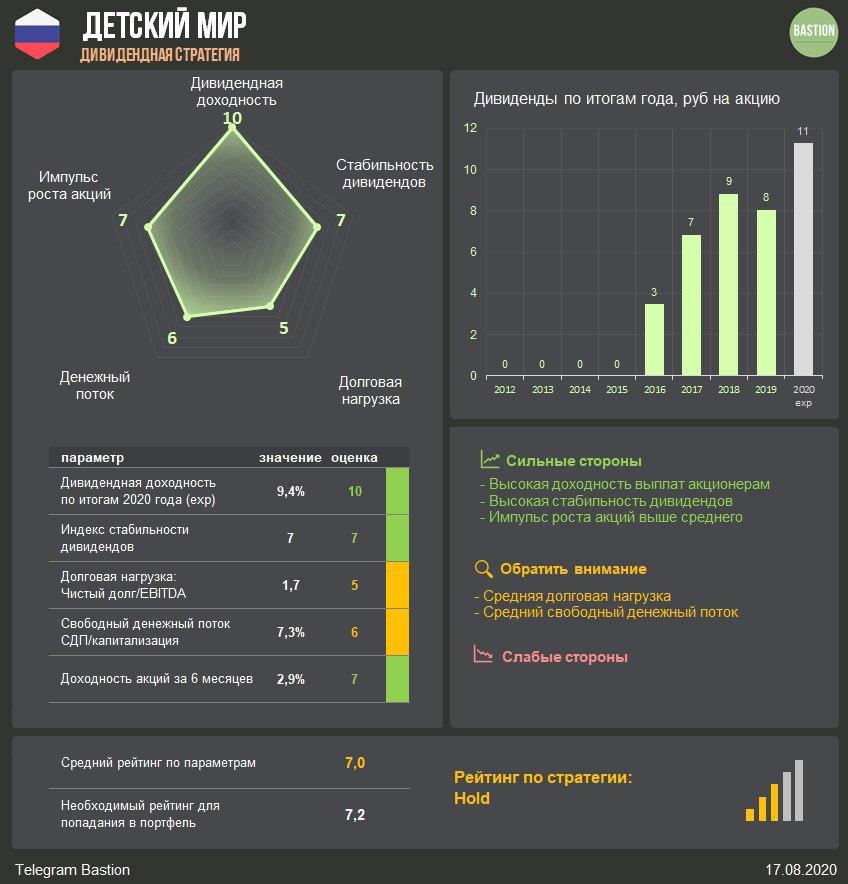 Факт дополнительной выплаты - сигнал менеджмента об улучшении финансового состояния компании после снятия карантинных мер. В июне рост продаж Детского мира ускорился до 22% в годовом выражении. В апреле падение достигало 20%. Акция есть в дивидендном портфеле, но имеет небольшой вес из-за высокой долговой нагрузки.