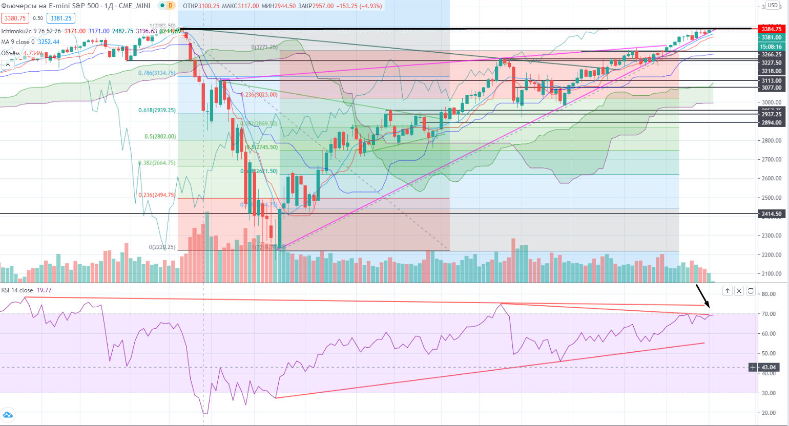 На часах уровни для покупки мне видятся 5242-5247, можно покупать со стопом 5230-. В шорт пока нет однозначных уровней, т.к. противоречия с RSI сохраняются. В глобальный лонг возможно входить при проходе локального хая 5323, RSI пробьет свой дивергентный тренд и можем получить подтверждение пробоя.