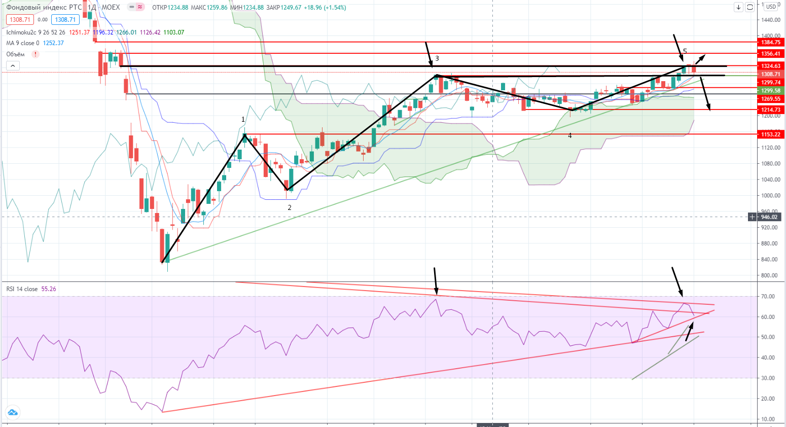 Вчера на нашем рынке индекс РТС попробовал сверху свою поддержку 1300, а с учетом того, что на RSI не было дивергенции на хаю 1326 (я не учитываю докоронавирусные уровни) и подход его к своему локальному дивергентному тренду я думаю что новый канал 1300-1326 именно то, что нас ждет на сегодня. Причем пробой хая не будет означать покупку, т.к. RSI просто не успеет за ценой, а вот проход вниз будет означать возможно(!) начало падающей тенденции.