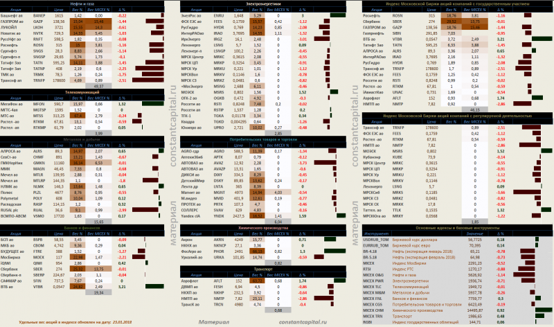 Динамика акций за текущий день, в структуре отраслевых индексов, и индексов государственного сектора.