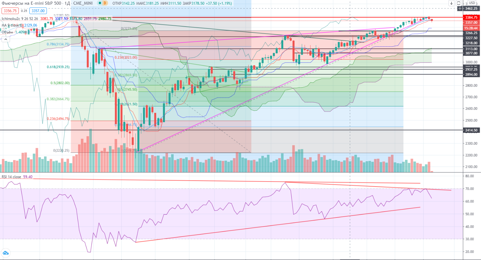 В Америке наконец-то началась первая попытка коррекции. Это напрашивалось постоянно последнее время. Анализировать до куда эта коррекция продолжится не буду, но это хоть какой-то звоночек.