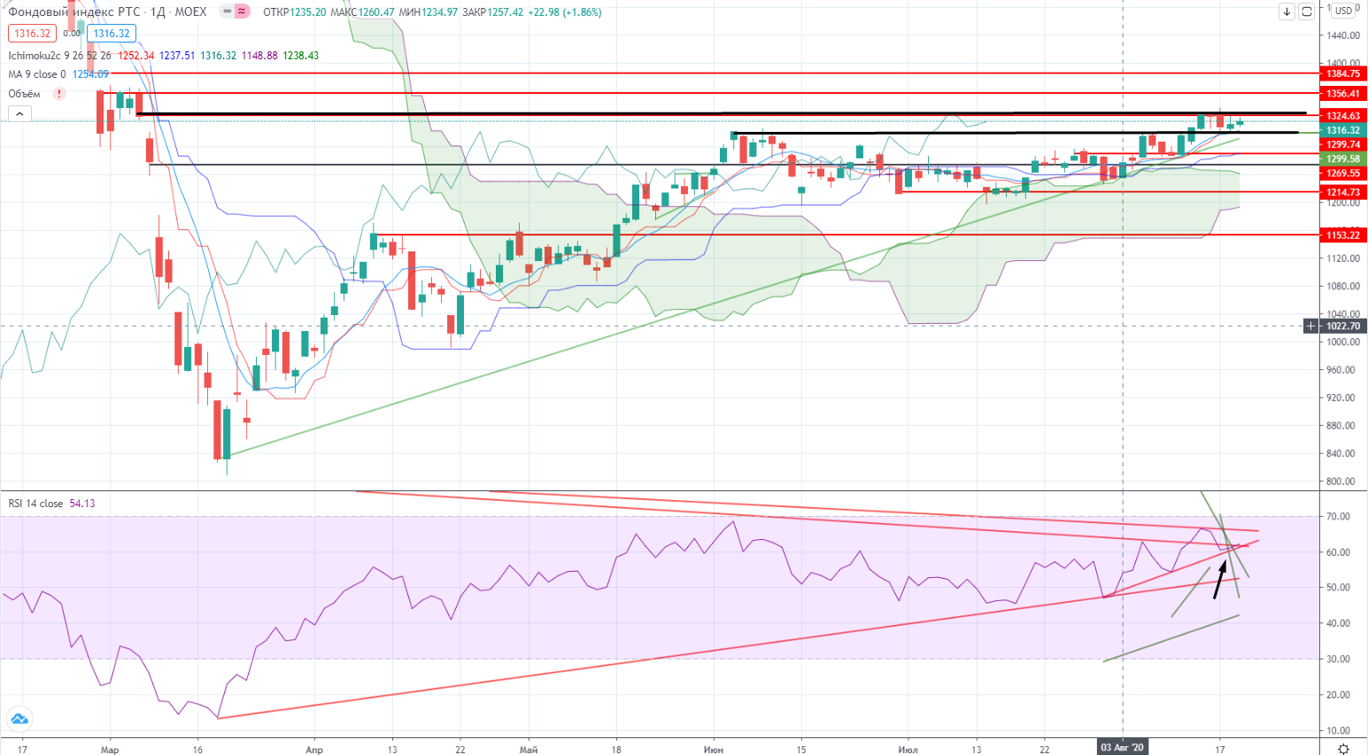 Пила и на нашем рынке продолжилась. Индексу РТС не хватает драйверов выйти выше верхнего уровня гэпа 1323, но и негативных факторов уйти ниже 1300 тоже пока нет. Вот и болтается внутри этого канала. Но сегодня есть возможность протестировать 1300 снова.