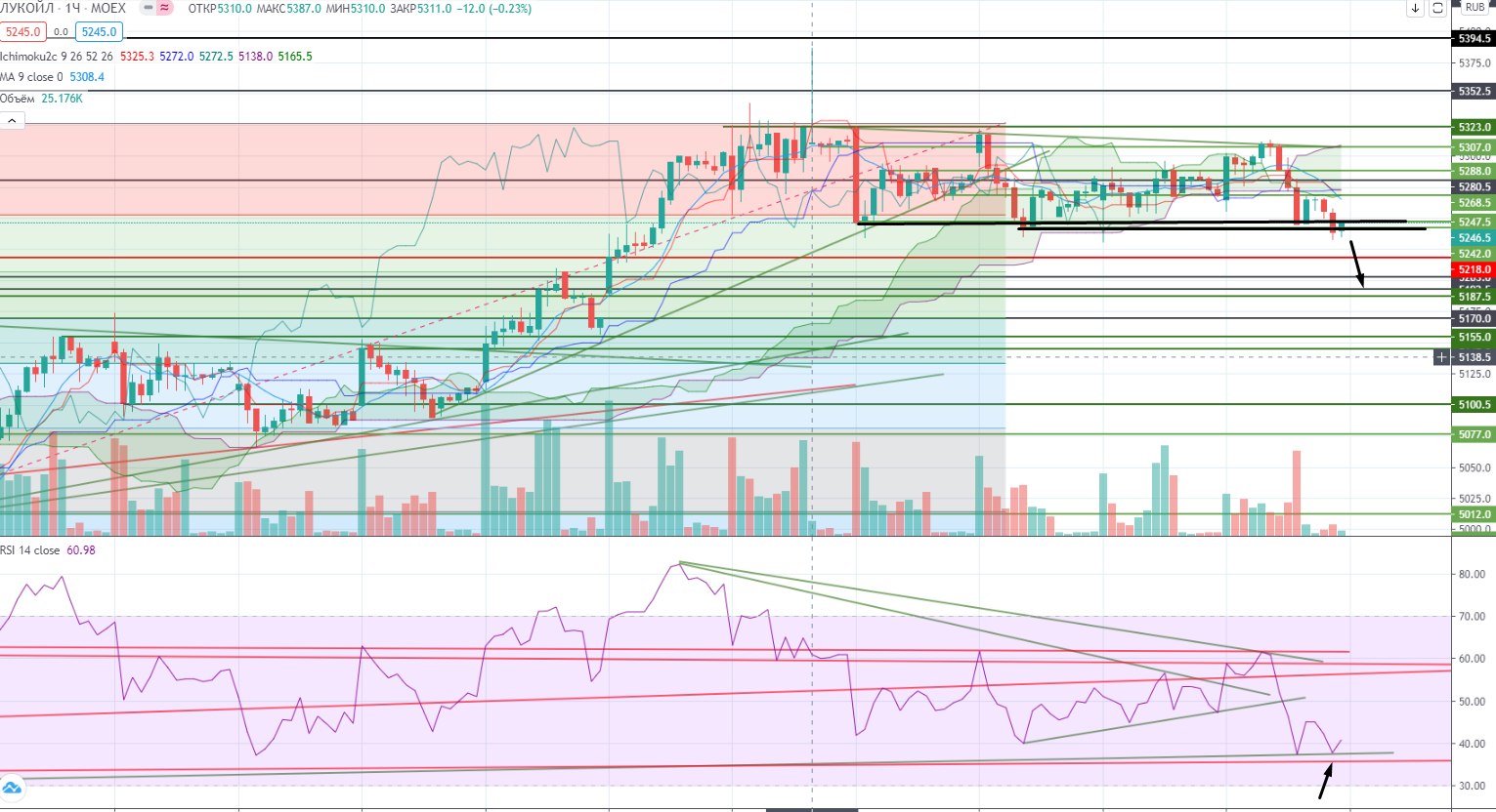 В Лукойле также пока можно пробовать покупать по 5243-5247 со стопом 5230-. И возможно даже с переворотом вниз. При проходе вверх я пока не вижу уровней для относительно безопасного входа из-за возможного расхождения с RSI. Короче говоря надо смотреть как туда (если это случиться) подойдем.