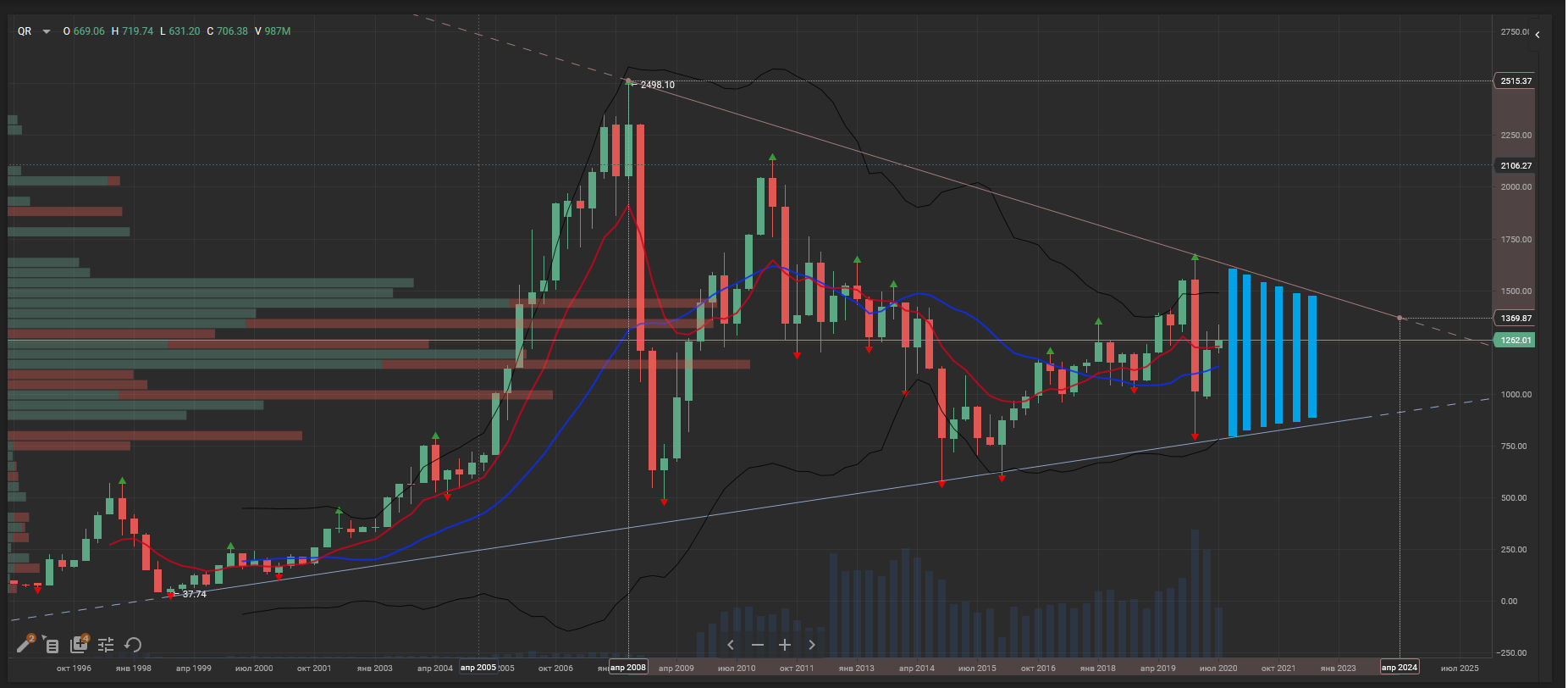 Сидел играл разными ТФ и вот такую штуку увидел на квартальном графике РТС.