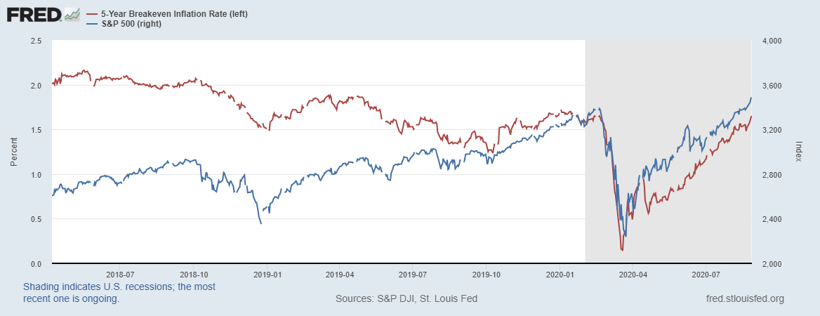 На картинке ожидаемая инфляция и котировки S&P500 (синяя линия)