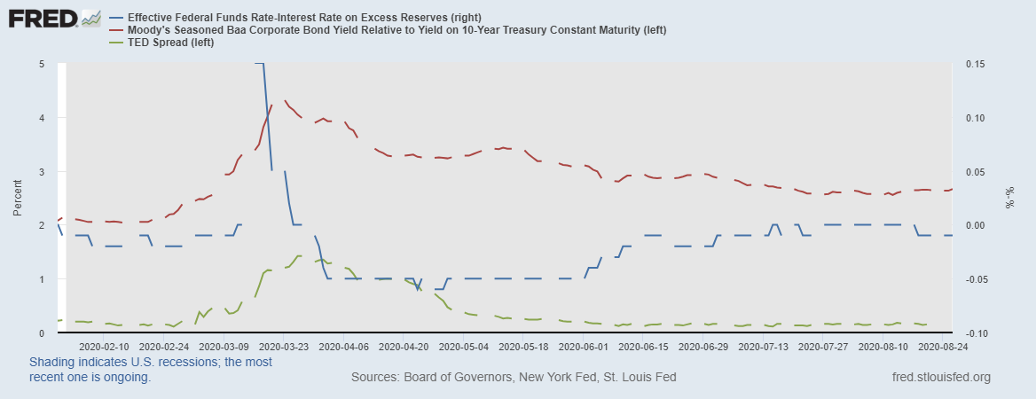 Синяя линия – это разница (спред) между эффективной ставкой (рыночная ставка) и ставкой по избыточным резервам (учетная ставка ФРС). Как видим, спред обосновался ниже ноля, что говорит об избыточной ликвидности.