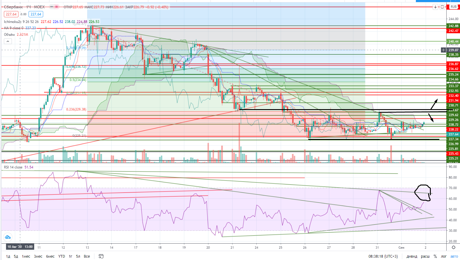 В Сбербанке на часах все движение выродилось в канал (что уж говорить про daily) 225-229,4-(229,7-), торговать можно в обе стороны в зависимости от нахождения цены, стопы нужно ставить по 224,8- и 229,9+ соответственно. Вставать же в сторону пробоя или не вставать тоже буду решать по ситуации. Все будет зависеть от RSI, где он будет находиться относительно глобальных трендов. Если не будет «дырок», то можно и вставать, но если все же будут, то лучше пропустить данную сделку. Лучше пропустить начало движение и вставать на коррекции, чем терпеть сразу убыток.